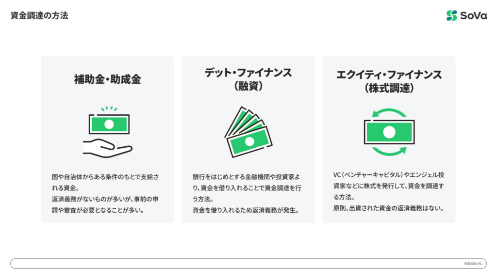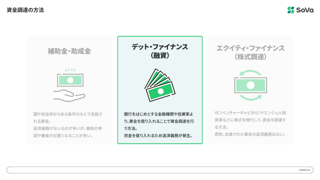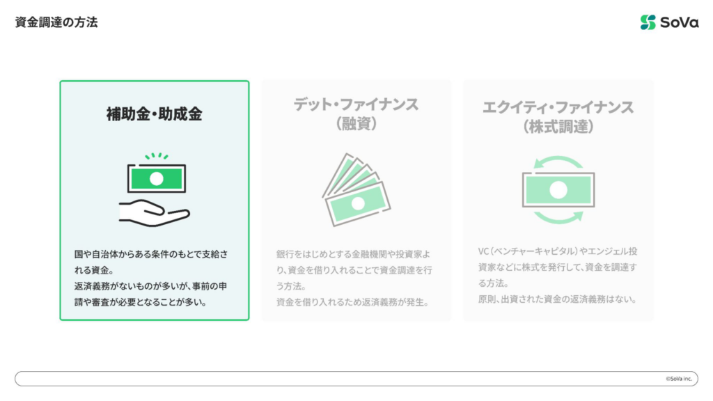 資金調達は「補助金・助成金」「デット(融資)」「エクイティ(株式)」に大別されます。