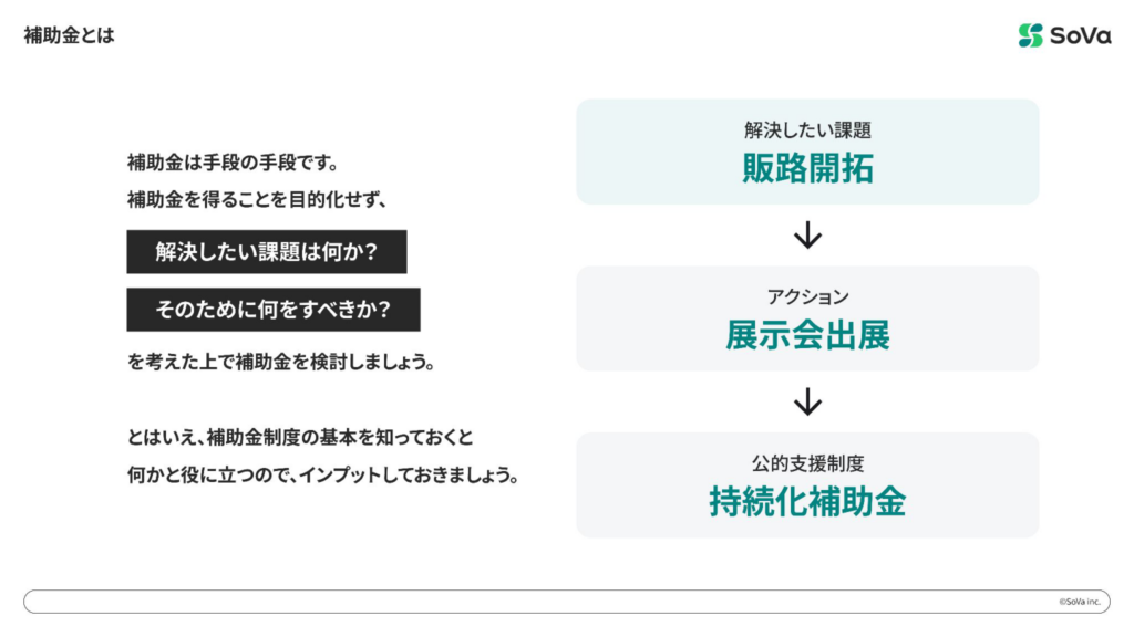 補助金は“目的を達成するための支援”で、制度理解が行動(販路開拓など)のきっかけにもなります。