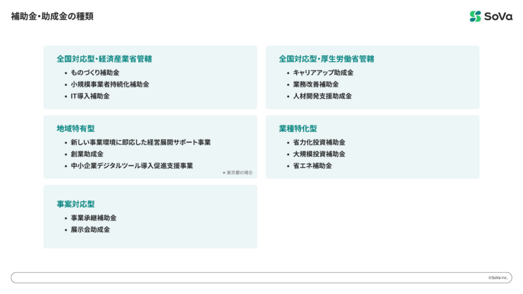 ②補助金の種類(経産省系/厚労省系/地域特有型/業種・事案対応型)と、探し方のコツ