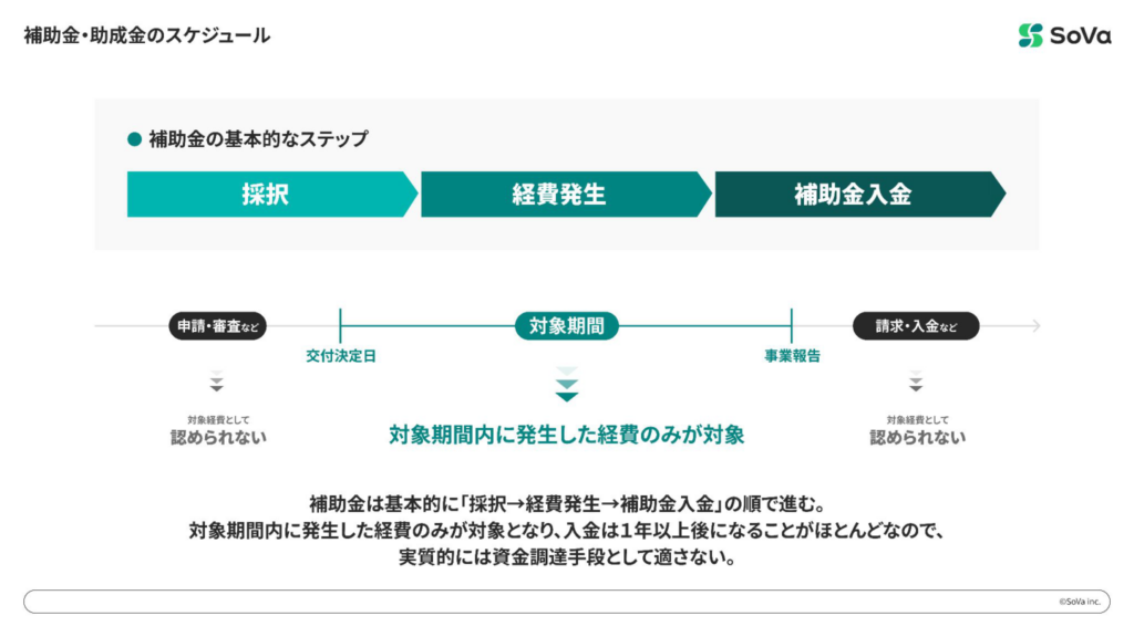 基本は「採択→経費発生→補助金入金」の順で、対象期間内の支出のみが対象になります。