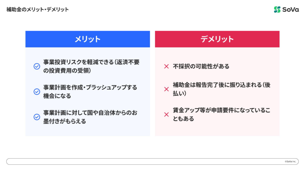 ④補助金のメリット/注意点(不採択リスク、後払い、賃上げ要件など)
