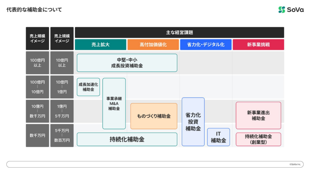 売上規模や目的(売上拡大/高付加価値化/DXなど)により、代表的な補助金の位置づけが変わります。