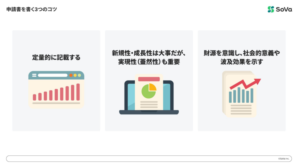 採択されやすい申請書は「定量化」「実現可能性」「財源意識・社会的意義」の3点が鍵です。