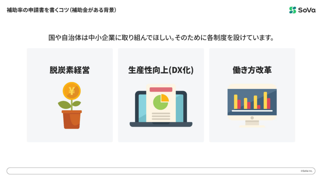 国や自治体が“やってほしいこと”(脱炭素/DX化/働き方改革など)を理解して合わせにいきます。