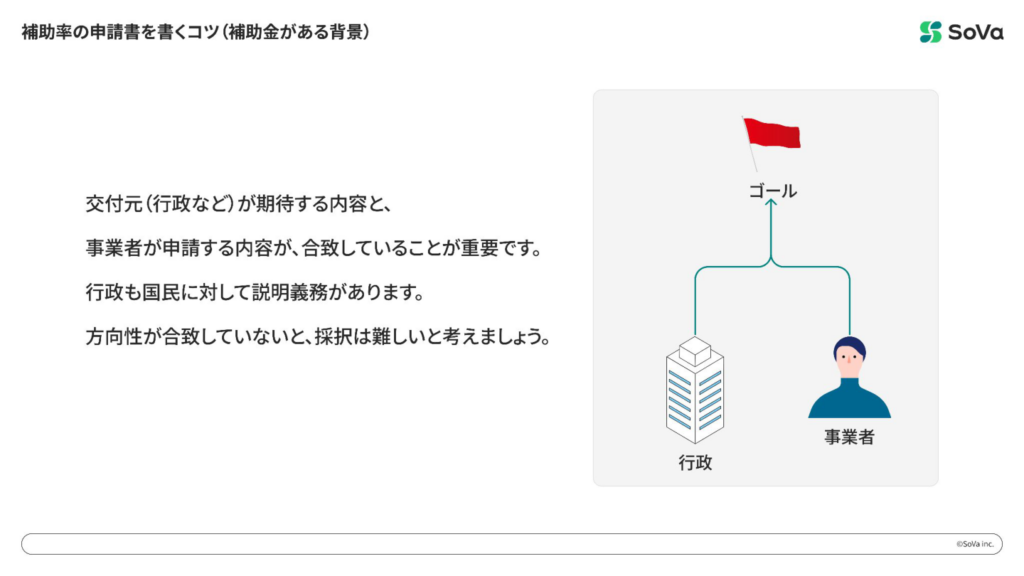 交付元の期待と申請内容の方向性がズレると通りづらい—「行政目線」で整合性を取るのが重要です。