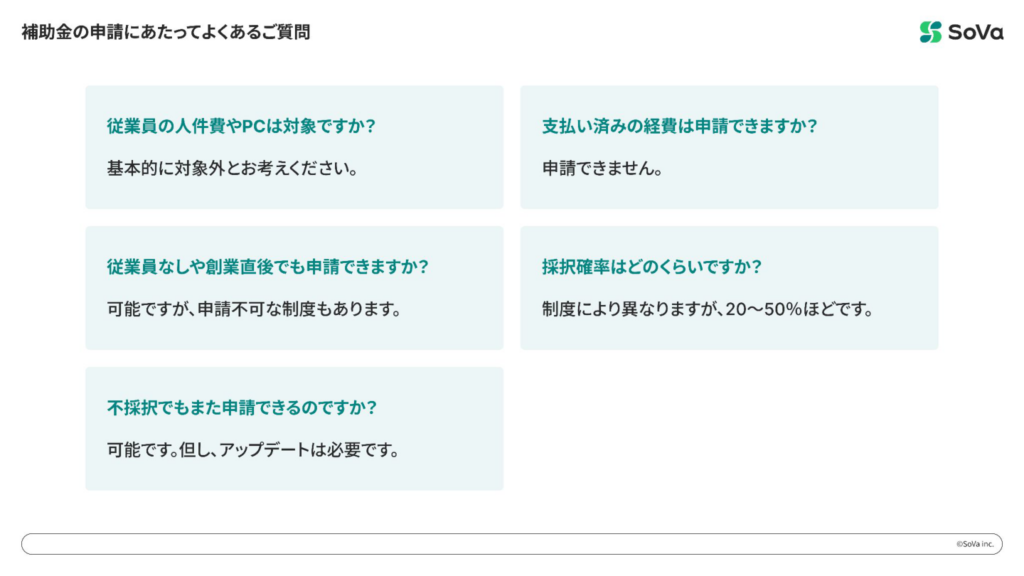 人件費・PCの扱い、支払い済み経費、創業直後の申請可否、採択率など“よくある疑問”を整理します。