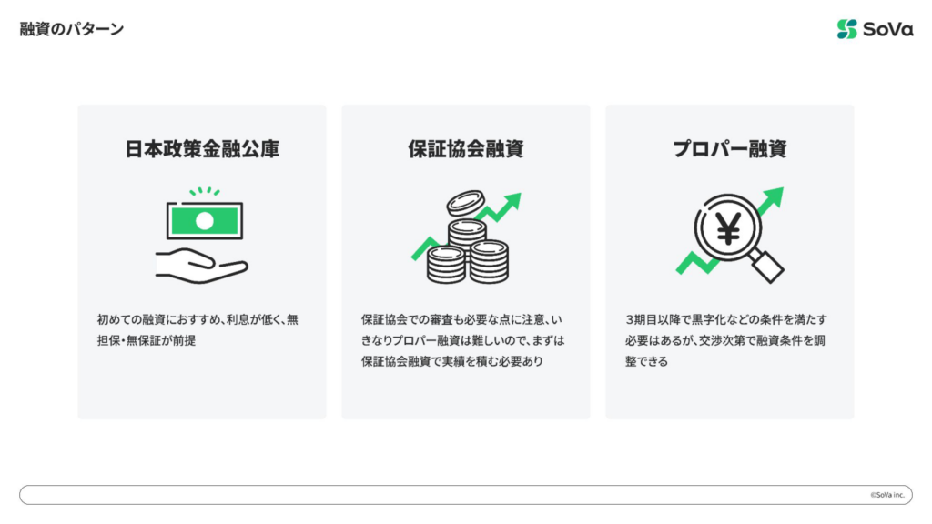 融資は「日本政策金融公庫」「保証協会融資」「プロパー融資」の3つが基本です。