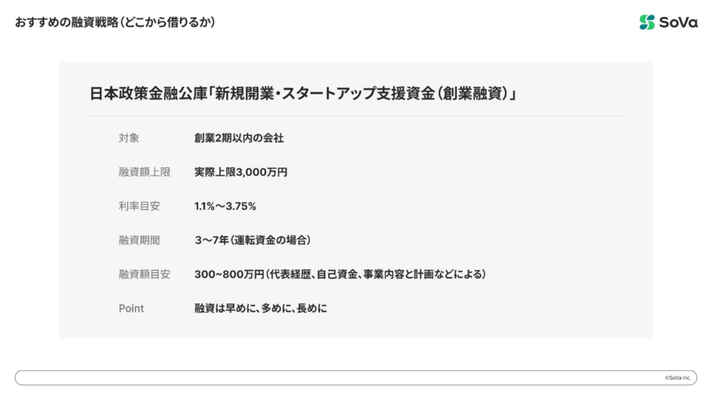 創業期はまず公庫(新規開業・スタートアップ支援資金など)から検討するのが王道です。