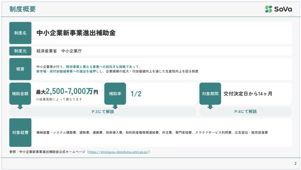 既存事業と異なる新市場・高付加価値事業への進出を後押しする補助金制度です。